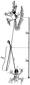 Kompletní sestava k sebejištění s tlumičem pádu (bez šplhadla)navázat. Prsní a sedací úvaz na těle vzájemně spojte pomocí krátkého kusu lana, který nejdříve svažte nad sedacím, pak nad prsním úvazem (nejsnáze vůdcovskými, lépe však osmičkovými uzly). K takto vzniklé spojce přivažte tlumič pádu pramenem lana, který z něj vychází. Postupujte podle obrázku. Pod tlumičem nechte dostatečný volný průvěs lana cca 1 až 1,2 m nutný k prokluzu, na této vzdálenosti si nachystejte jednoduchý osmičkový uzel, z něj vycházející konec provlékněte postupně závěsným okem tlumiče a spojkou mezi prsním a sedacím úvazem (viz obr. ), nakonec jej vraťte do nachystaného osmičkového uzlu a protisměrně jej okopírujte a dotáhněte. Tím vznikne spolehlivý dvojitý osmičkový uzel.