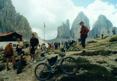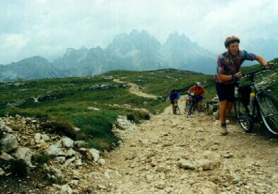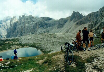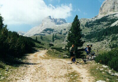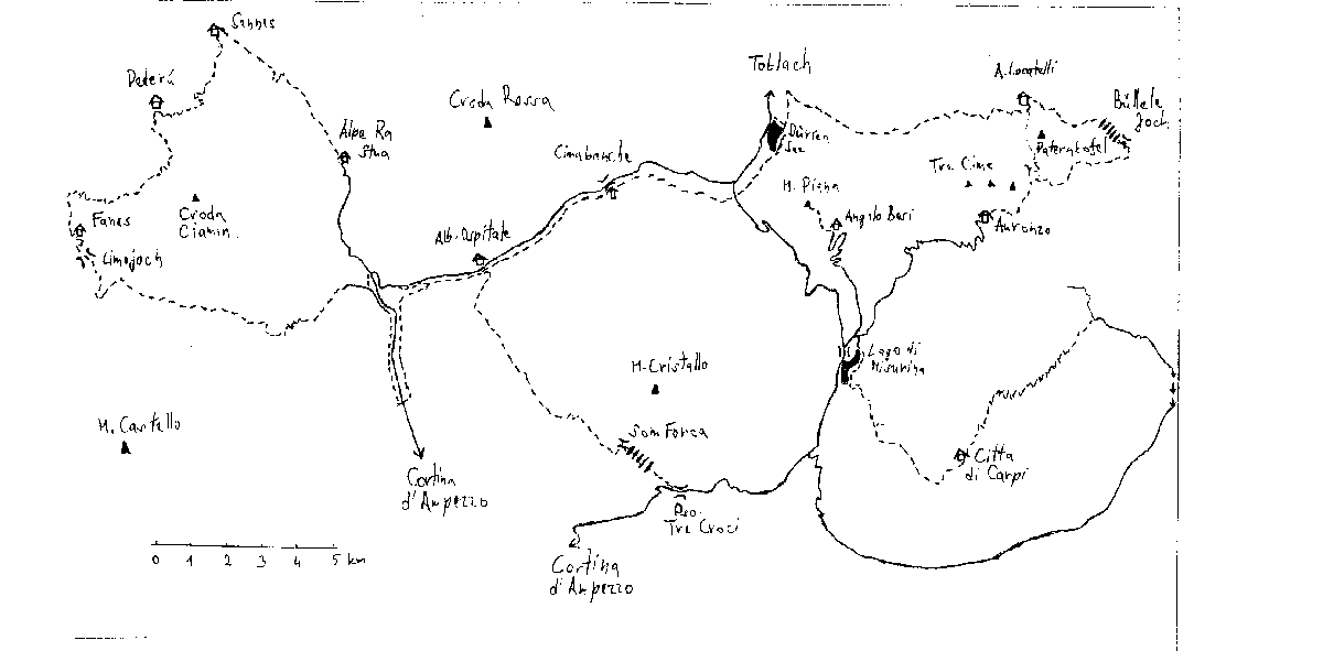 Na neoficiální tábořiště (cca 1450 m n.m.), ležící v údolí řeky R. Popena, severně od Lago Misurina, jsme přijeli autobusem v cca 9,30. Odjezd na túru na kolech v cca 11,00. Po státní silnici před L. Misurina (1752 m n.m.), pak vlevo ke kempu Alla Baita (tel.: 0039/436/39039, cena za noc a osobu 8000 ITL, za stan 6000 ITL - údaje z roku 1997). Vpravo od silnice u kempu je pramen. Na křižovatce u kempu podle šipky (nápis Rif. A. Bosi) vlevo po asfaltové silnici, zpočátku střídané zemními úseky (kousek nad křižovatkou po pravé straně pramen pitné vody) strmě vzhůru (v závěru po značce č. 122) k chatě Rif. Angelo Bosi (2205 m n.m., převýšení +755 m) a pak po šotolinové cestě (zn. č. 122) a kamenité stezce (občas je zde nutné kola tlačit) do oblasti těžkých bojů za 1. světové války - na jižní vrchol Monte Piano (2324 m, převýšení +119 m), prohlídka pozůstatků výzbroje, munice, zákopů.