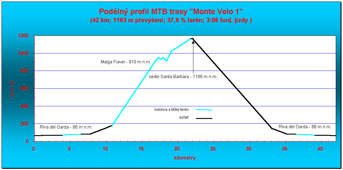 Vzhledem k tomu, že většinu tras absolvovala velká skupina osob obého pohlaví s rozdílnou fyzickou kondicí i kvalitou kol (včetně trekkingových kol !), je výsledný celkový čas jízdy se započtením přestávek silně ovlivněn rychlostí toho nejpomalejšího účastníka (mnoho úseků slabší účastníci tlačili, tlačit kolo častěji museli i jezdci na trekkingových kolech). Spoustu času jsme taky strávili lepením nebo výměnou prasklých duší, fotografováním, jídlem a opalováním. Pro trénované jedince, kteří se během jízdy ani jednou nezastaví, by proto měl být vodítkem spíše můj čistý čas jízdy. Neodpustím si ještě jednu připomínku: v létě, když neprší, je i ve vysokohorských polohách Dolomit (nemluvě už o Lago di Garda) strašné vedro a na vápenci je vody málo. Vezměte si proto s sebou na túru dostatečné množství vody (min. 1 litr).
