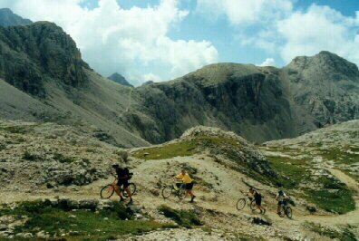 Během prvního zájezdu jsme pokračovali na kolech do sedla Forc. Dei Castrati (2272 m n.m.), ale odtud jsme pak střídavě vedli a nesli kola (zn. č. 6) do údolí Val di Rimbianco a dále (zn. č.103) až do údolí Valle della Rienza (sestup -692 m). Stezka byla však tak zarostlá větvemi kosodřeviny a tak strmá, že byl problém zde s kolem i jít.