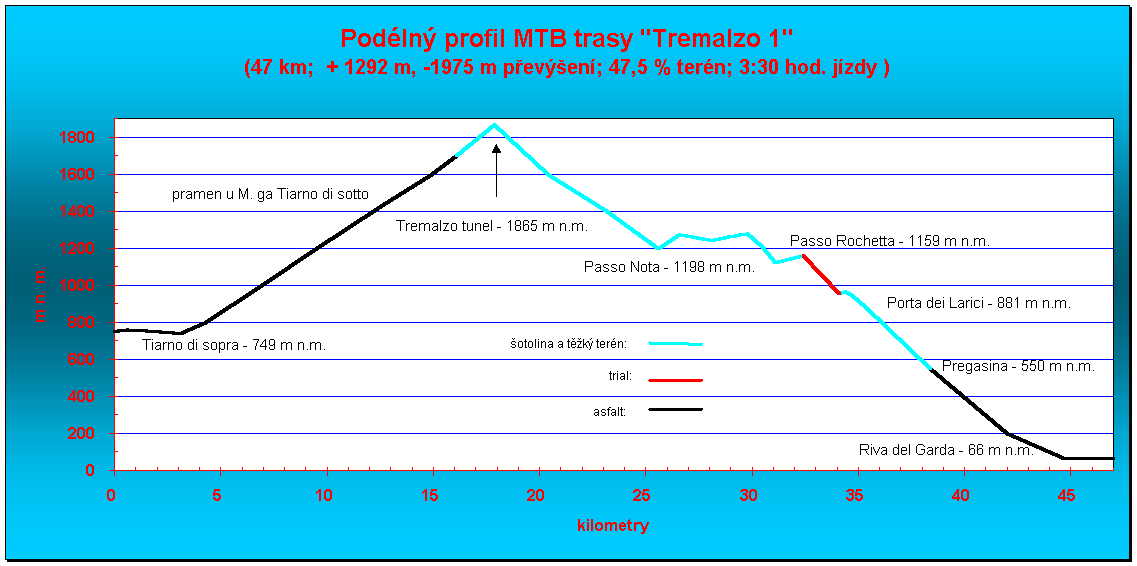 Doba jízdy včetně přestávek - 8 hodin 30 minut. Čistá doba jízdy dle mého cyclocomputeru: 3 hod. 1 min.. Ujeto 33,5 km (13,5 km asfalt, 20 km šotolina a těžký terén). Průměrná rychlost 11,1 km/hod. Převýšení : a, jízda po asfaltu + 870 m, -0 m; b, jízda v terénu +435 m, -1133 m; c, snášení kola -172 m. Celkem převýšení cca +1305 m, -1305 m.