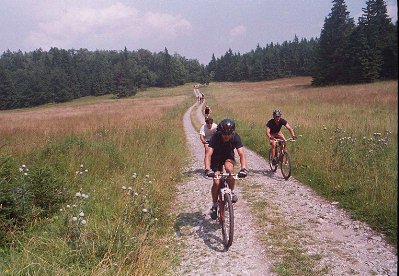 Popis trasy: Z Podlesku (540 m) stoupání (průměrný sklon + 8 %) po asfaltce (bez značky, Suchá Belá po levé straně) na Glackou cestu (940 m), na křižovatku modré, zelené a žluté značky. Odtud vpravo stoupání (+ 6,6 %) po modré značce (stále asfalt) na křižovatku se žlutou značkou (980 m) - Malá polana, dále po žluté značce (nezpevněná lesní cesta) na křižovatku se zelenou značkou (990 m) - horní konec Sokolej doliny, a pak po zelené značce (nezpevněná lesní cesta) mírné stoupání na křižovatku se žlutou značkou (1010 m), která leží poblíž vrchu Bykárka (1057 m). Následuje asi kilometrový velmi prudký terénní sjezd, či spíše vedení kola (- 23 % !!) po žluté značce k vodní nádrži Klauzy (640 m). Větší část sjezdu je za mokra velmi nebezpečná - kolo klouže na vápencovéch kamenech, větvích i v blátě. Dále vpravo (na jih) po zelené značce. Zpočátku stoupání (+ 6 %) po značce po šotolinové lesní cestě , od nadmořské výšky cca 790 m (cesta tvoří protisměrnou serpentinu a vede po dřevěném mostku přes potok) se nám značka ztratila (zřejmě odbočuje ze široké lesní cesty na užší, sice značenou, ale nesjízdnou, pěšinu doprava strmě vzhůru) a my jsme pokračovali po pěkné šotolinové cestě až do sedla (820 m) - poznávací znamení: na pravé (jižní) straně sedla je cedule ŠPR Holý kameň. Dále trasa pokračuje BEZ ZNAČKY mírně vpravo (pozor, původní lesní šotolinová cesta klesá ze sedla dolů do údolí potoka Lesnica vlevo od správné cesty a dovedla by vás zřejmě do Čingova nebo do Spiškej N. Vsi ) po lesních nezpevněných tzv. přibližovacích (traktorových) cestách. Zpočátku traverzuje s minimálními změnami výšky severní svah hřebene Holý kameň - Dubnica, po cca 1,5 km na první křižovatce je nutné dobočit kolmo vpravo, poměrně strmě vzhůru na hřeben (jihozápadním směrem). Asi kilometrové, stále strmější stoupání vám dá zabrat, ale dá se vyjet. Po dosažení nejvyššího bodu lesní cesta traverzuje z jihovýchodní strany hřeben Holého kameňa a pak mírně klesá až na louku. Zde jako by cesta končila, ale je možné pokračovat dále po přejetí louky v levém spodním (jižním) jejím okraji. Odtud cesta již klesá prudčeji ve vyjetých traktorových kolejích až na rozcestí. Je nutno pokračovat mírně vpravo po vrstevnici a nenechat se zlákat očekávaným sjezdem vlevo do doliny Flajšer (směr Novoveská Huta). Po cca 300 m jízdy po rovině se neznačená cesta připojuje na žlutou značku. Odtud vpravo po žluté, přes křižovatku s modrou, až na křižovatku se zelenou značkou (1050 m). Od křižovatky, stále po zelené značce (kamenitá lesní cesta), téměř po rovině na rozcestí značených cest u hotelu na Geravách (1080 m).